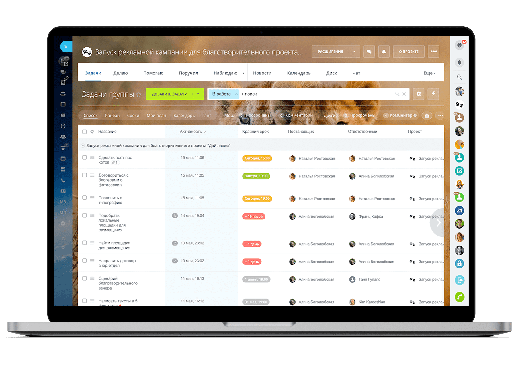 Новостная лента может стать местом, где кипит жизнь в компании. Прямо из поста создавайте задачи, проводите опросы, записывайте видеообращения.