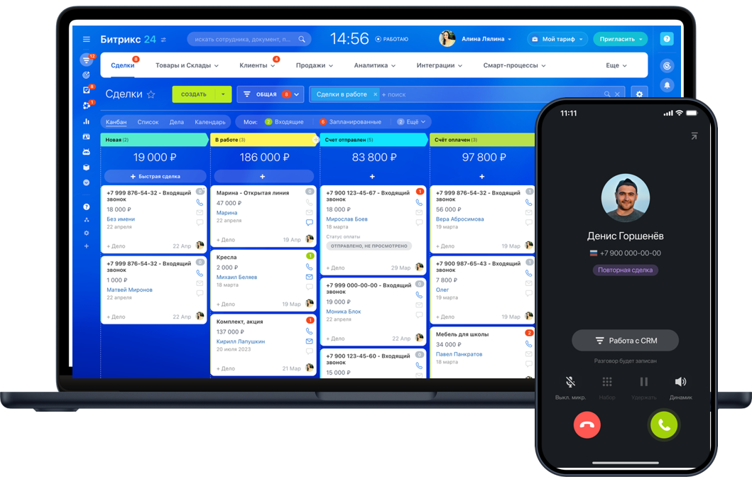 Всё необходимое для продаж уже есть в CRM. Ведите складской учёт, реализуйте товары и контролируйте остатки. Выставляйте счёт на оплату и оформляйте доставку прямо из карточки сделки – клиент сможет оплатить прямо в диалоге с вашей компанией.